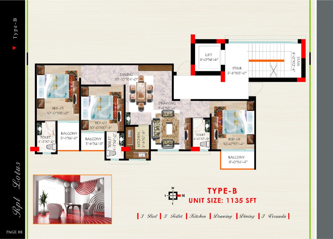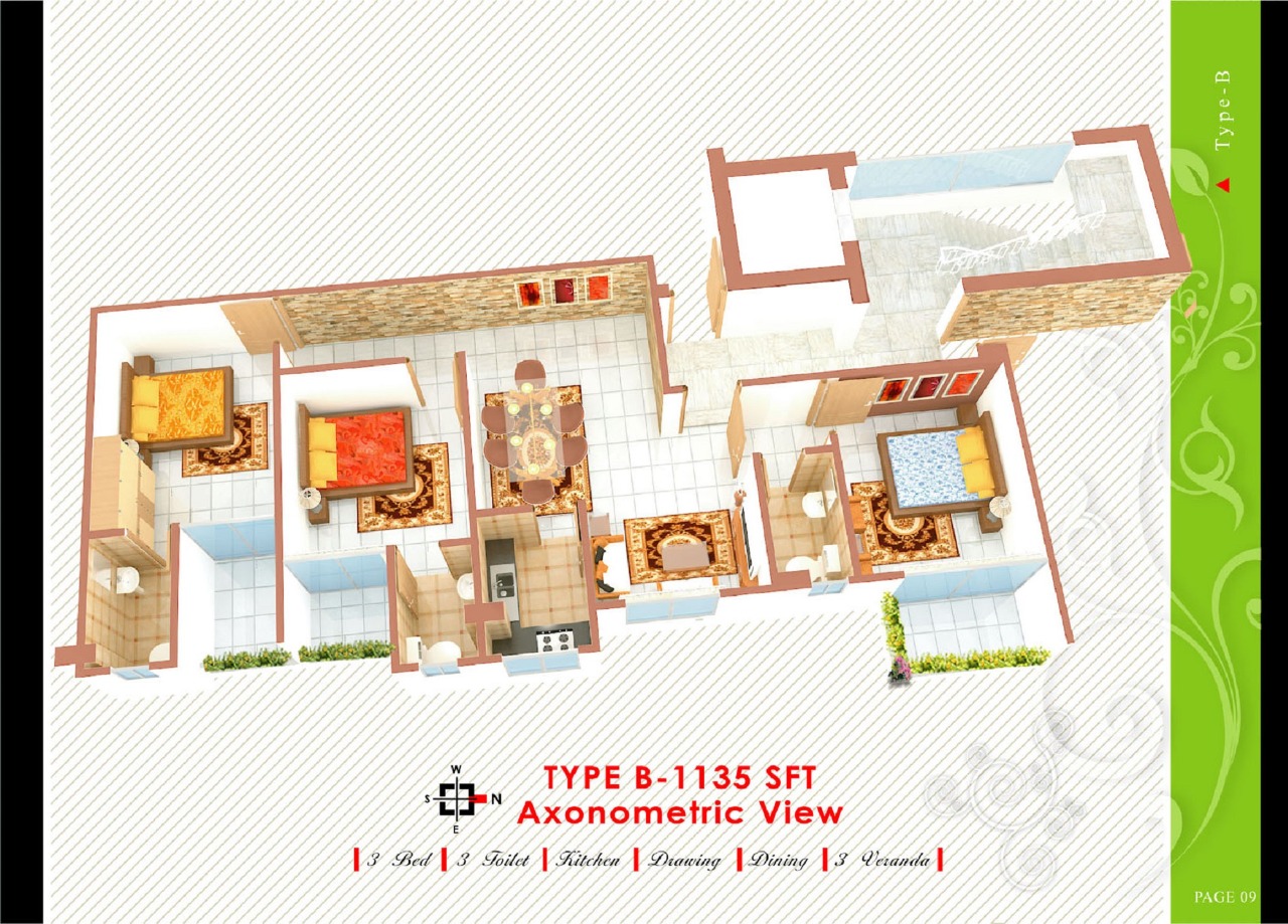 3 Toilet, 3 Balcony & Kitchen.